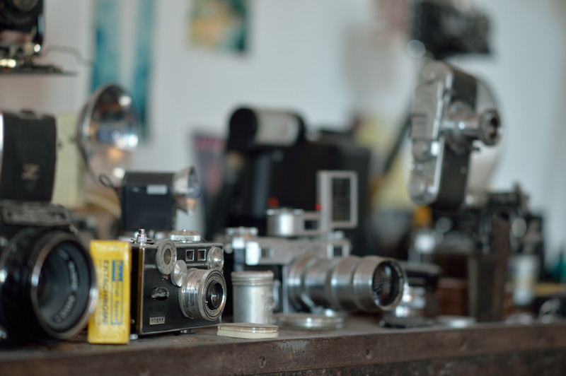 Some older rangefinder cameras: focus is set on the Argus C3 you might know from the "Harry Potter and the Chamber of Secrets" movie. Next in the row is the KIEV 4A (Contax made in the USSR) and the Zorki (Soviet Leica copy). |