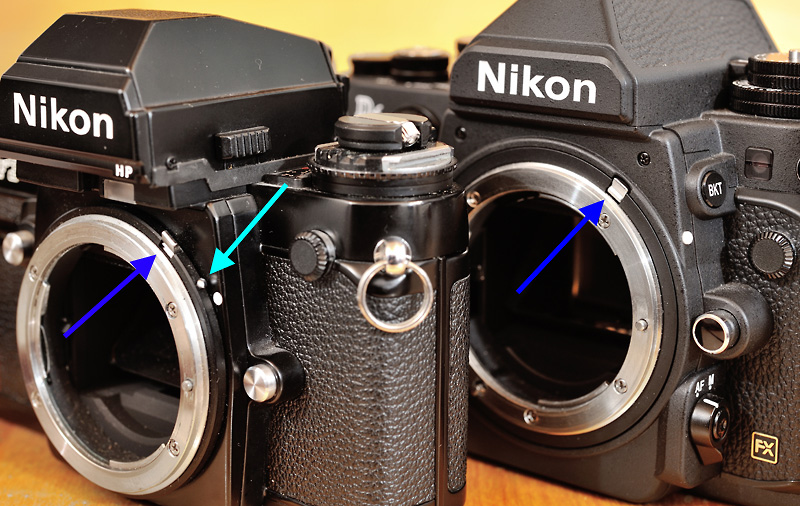 Nikon F3 and Nikon Df with folded-up AI coupling (blue arrows). On the older cameras you have to press a little button (cyan arrow) in order to release the coupling. The Df has a slight resistance that keeps you from folding it up accidentally. |