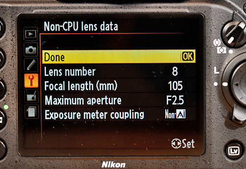 In the non-CPU lens data settings of the Df you must also specify the type of exposure meter coupling (AI or non-AI). |