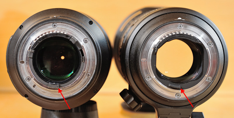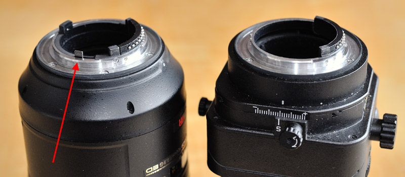 The interfaces of a 'G' lens (on the left: AF-S Micro-Nikkor 105mm f/2.8 G) and an 'E' lens (on the right: PC-E Micro-Nikkor 85mm f/2.8). A 'G' lens has at least one mechanical coupling element (red arrow): the aperture lever, which, since the days of the Nikon F, is needed for stopping down the lens just before the shutter opens. In contrast, the diaphragm of an E lens is driven electrically. |