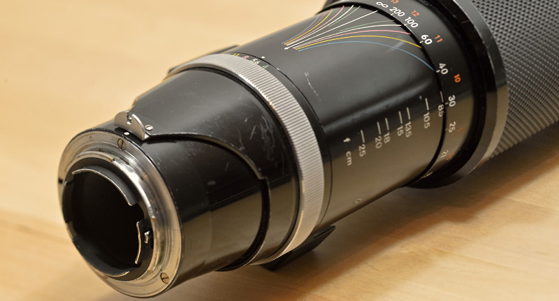 Pay attention! Usually a Nikkor has a fixed silver ring for easy grabbing. But here, the silver ring is the aperture ring! BTW: the orange numbers on the focus scale show the distances (in feet) when the close-up lens is attached. |