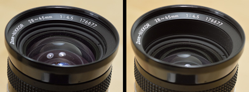 The front element of the lens is recessed. To the left, the lens is set to 28mm and infinity, to the right, it is set to 45mm and infinity. Both, the longer the focus length and the longer the focus distance, the more recessed the front element is. It is one of the very few lenses I have used without a lens hood. If you want to use a lens hood, Nikon HK-1 is the proper one. |