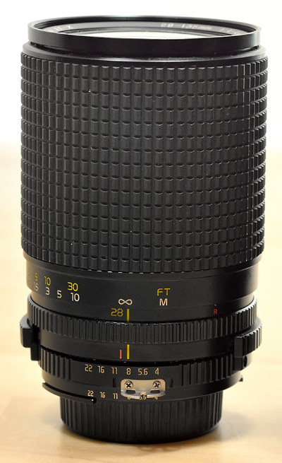 Zoom-Nikkor 28-45mm f/4.5, mounted on a Nikon FM. This is an early sample of the lens that has been factory AI'd. The size of the lens does not change through zooming or focussing. The filter thread does not rotate and has a diameter of 72mm. It is a compact lens with a length of about 80mm (measured from the mount) and a weight of 450g. The minimum focus distance is 0.6m. |