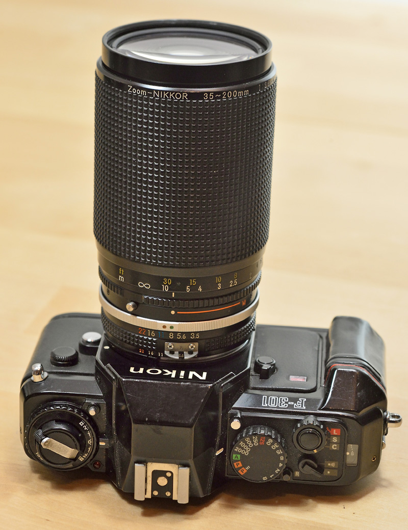 Zoom-Nikkor 35-200mm f/3.5-4.5 on the Nikon F-301, Nikon's first SLR with an integrated motor drive. Both camera and lens were introduced in 1985. Together, it is a great combo for travelling! I would just add a Nikon 6T close-up lens and a 20mm Nikkor. The lens weighs 750g, the length measured from the mount is around 130mm, the filter thread has a diameter of 62mm and the proper lens hood is HK-15. The shortest focus distance is 1.6m. There is a special macro setting at the short end. |