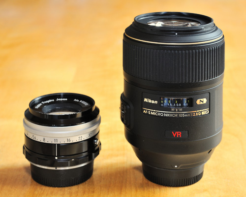 The AF-S 105mm with its great-great-grandfather, the Bellows-Nikkor 105mm f/4. Lenses seem to grow over the generations! |