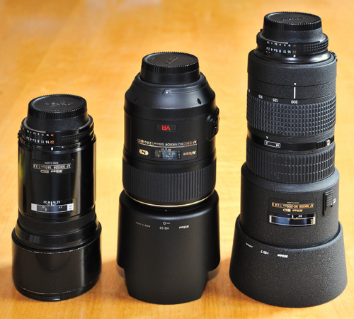 Size comparison: AF Nikkor 180mm f/2.8 (hood is built-in), AF-S Micro-Nikkor 105mm G with hood, AF Nikkor 80-200mm f/2.8 D with hood. Of course, you can save space in your bag if you mount the hood reversed, but that requires additional handling if you swap lenses. |