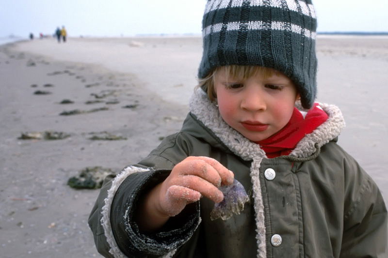 "Daddy, what's this"? My daughter with a small jellyfish on the beach of St. Peter-Ording, Germany in spring 2001. Captured on Fujichrome Sensia with Nikon F4 and Nikkor 35mm f/2. |