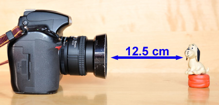 At closest focus (0.25 m) the distance between the front of the hood and the subject is about 12.5 cm and the magnification is about 1:4.4. |
