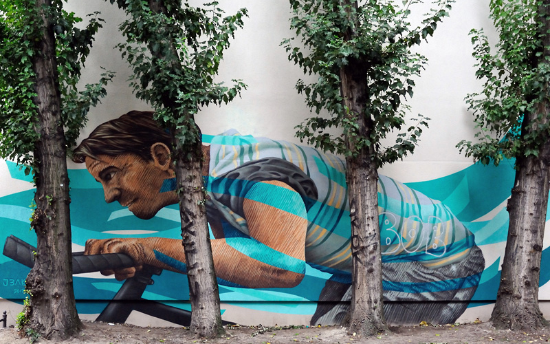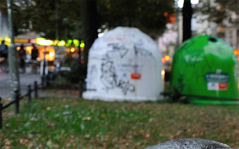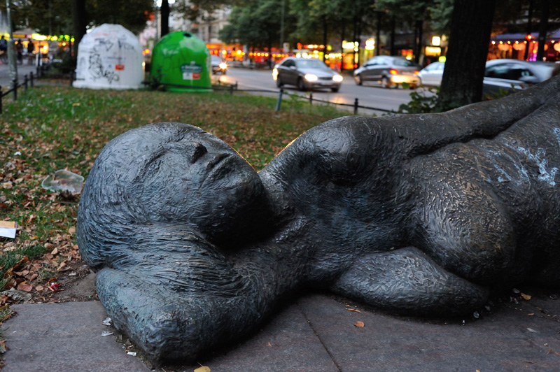 A part of the sculpture ensemble "Die Begegnung" by Azade Köker which in turn is a part of the "Menschenlandschaft" (I would translate it to 'human landscape'), a sculpture project in Kreuzberg, Berlin. Nikon D700 at ISO 800, F2 and 1/25 sec. Even wide open the AF 35mm f/2 D is pretty sharp and contrasty in the centre. But the bokeh is very nervous. |