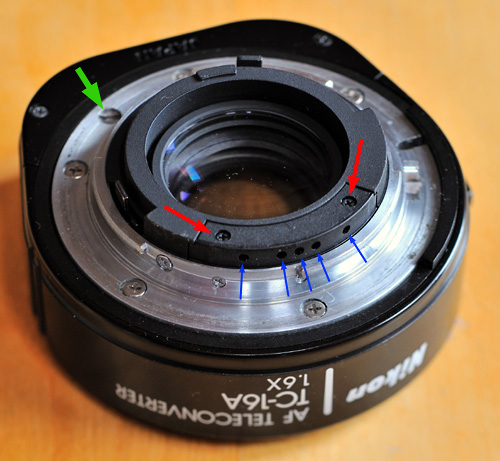 But this TC works only with the first generation of AF cameras. The manuals of modern cameras (including all DSLRs) forbid the use of this converter. No problem, it's easy to work around! You just have to disable the electronics. Screw out the two screws pointed by the red arrows. Lift up the complete block and pull out the electronical contacts (blue arrows). Screw everything together again, that's it. The TC-16A has a "screwdriver" AF coupling (green arrow). If you can not focus to infinity you must adjust the TC's focus with a screwdriver.