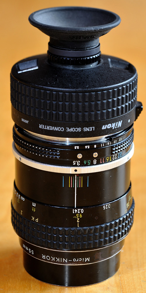 The Micro-Nikkor 55mm with the life-size adapter (PK-13 tube). The lens itself goes from infinity to a magnification of 1:2. In conjunction with the 27.5mm long tube it goes from 1:2 to 1:1. Above the usual metre and feet scales you can find two scales with the magnification, the first for the lens itself and one the second for the use in conjunction with the PK-13.