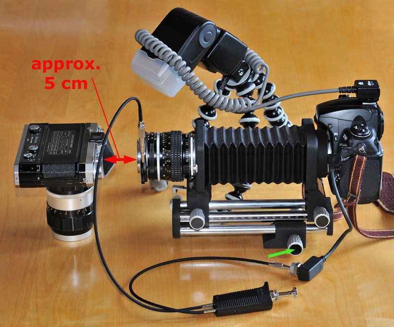 Setup for photographing with 4:1 magnification. Along the optical axis from the right to the left you find the D700, the PB-4 bellows unit, the BR2A reversing ring, the Micro-Nikkor 55mm f/3.5 and the BR-4 tube (providing a cable release port for stopping down). In the background on the GorillaPod the SB-700, connected via an SC-17 cable. In the foreground an old AR-7 double cable release for the automatic stop down of the lens. The connection from the AR-7 to the camera is made by two adapters: the MR-3 plus the MC-25. I used live view in this setup. After activating it and magnifying the image I took the cable release in one hand and made the fine-focussing on the tripod mount positioning knob (green arrow) with the other hand.