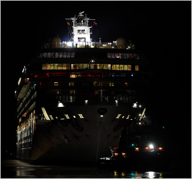 A new cruise ship has just left the shipyard in Papenburg and is now slowly moved by tugboats through the narrow river Ems towards the North Sea. 80-200mm @100mm on a tripod, F4, 1/5 sec, Nikon D200 @ISO400. |