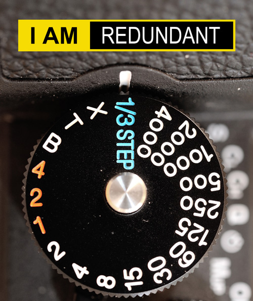 Let's begin with the shutter speed dial. It is a main element of the retro design. Nice to look at but almost useless! It offers a locked "1/3 STEP" setting, that activates the command dial instead. Only with the command dial you can use the complete shutter speed range from 30sec - 1/4000sec (in 1/3 steps).