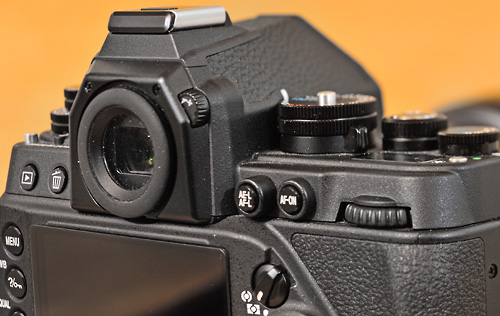 Exposure compensation: Nikon's traditional DSLR design allows it with the right hand while looking through the finder: press the button and rotate the command dial. The Df has a dedicated dial for it on the left-hand side of the camera. If you have a heavy lens on the camera you must use your right hand for it, which is not a good solution. Nikon would have done better to place the exposure compensation dial on the right-hand side, for example instead of the redundant shutter speed dial!