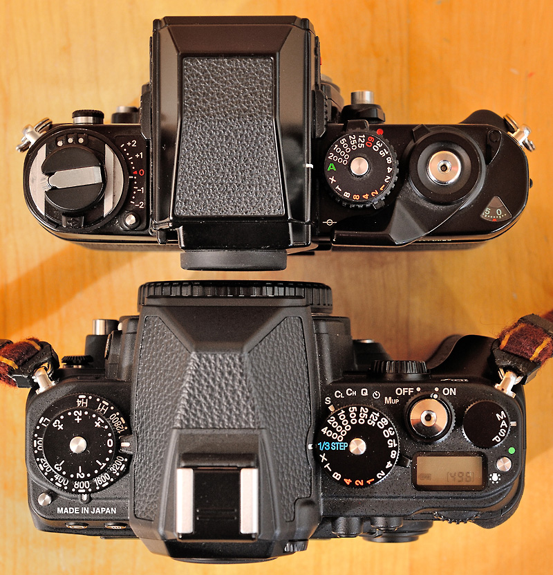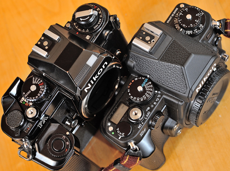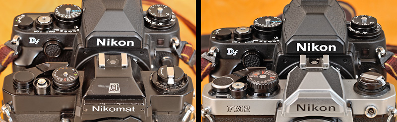 Sometimes you hear "the Df is the digital FM2". Of course, that is baloney, a DSLR cannot be a mechanical camera. Referred to the design it is also wrong - only the finder looks a little bit like a replica of an FM finder. The dials look more like those from the Nikkormat/Nikon EL series. But for example for the Df's mode dial, there are not any models in Nikon's history. The silver version (aka panda style) has a completely silver shutter speed dial, while every former Nikon SLR has a dial with a black topside...