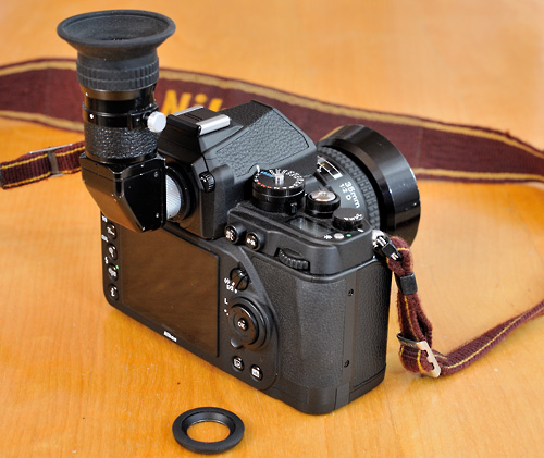 The right-angle finder DR-3, mounted via a DK-7 adapter. |