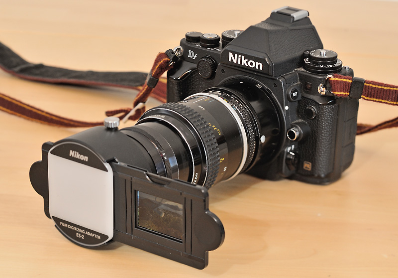 Well-working setup: Nikon Df plus AF-S Micro-Nikkor 60mm f/2.8 plus "62mm adapter A" plus ES-2 plus FH-4. |