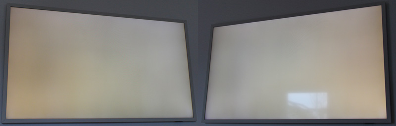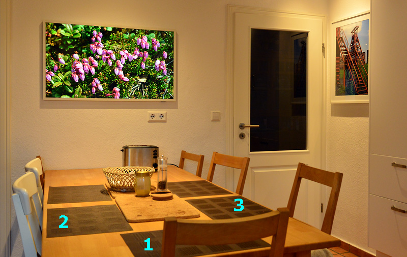 In my eyes, the biggest problem with The Frame is the insufficient viewing angle stability. The problem concerns the contrast, which becomes weaker with a flatter viewing angle, but also the colours! To illustrate the colour problem, I loaded a uniformly grey image into the screen. I switched off the light in the kitchen so that only the weak light of the overcast winter afternoon fell in. Then I captured an image from each of the seats 2 and 3: