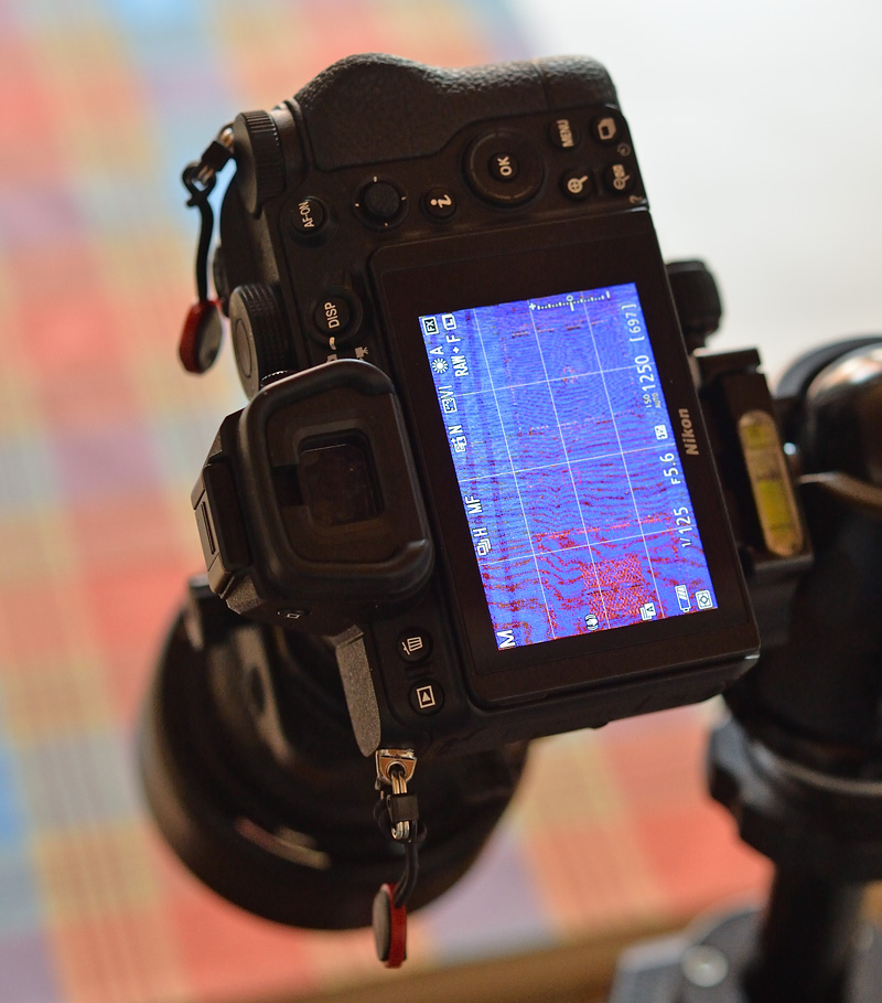 The Z5 is set to peaking level 1 and highlight colour blue. Photographing the tablecloth with my PC-E 85mm f/2.8, fully tilted. The problem with tilt is to find the plane of focus.