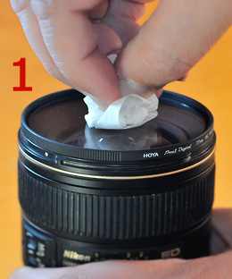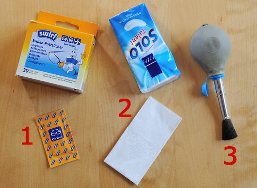 I crumple the lens cleaning tissue between my fingers. Then I clean the lens by moving the tissue spirally from the middle to the outside. Fingerprints and such things should have gone now (if not, repeat this step). But typically there remains a thin layer of cleaning liquid. Wait a moment, before you proceed to step 2!