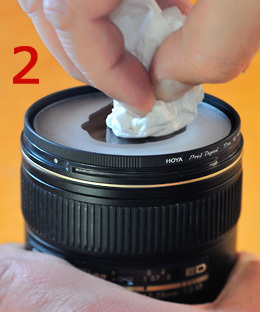 I breathe onto the lens and then I wipe the crumpled soft tissue over the lens in the same way as in step 1. The lens should be perfectly clean now, but there will remain some dust from the soft tissue.