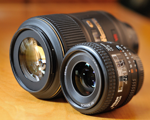 AF-S Micro-Nikkor 105mm f/2.8 and AF Nikkor 35mm f/2.8: using these lenses in the rain without a hood is foolish - in a moment you will have raindrops on the front element. |