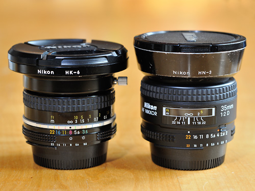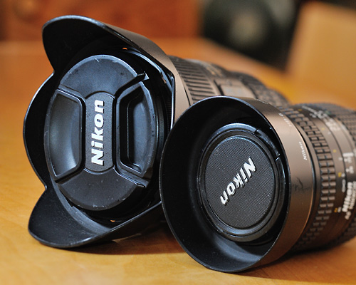 Nikkor 20mm f/3.5 with HK-6 Hood and AF Nikkor 35mm f/2 with HN-3 hood: a 77mm or a 72mm cap respectively fits perfectly into the front of the hood! |