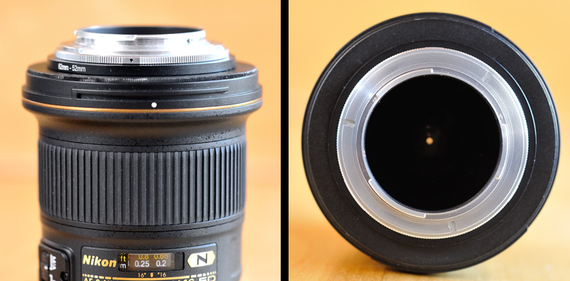 Nikkor 20mm f/1.8G plus 77-62 step-down ring, 62-52 step-down ring and BR-2A. |